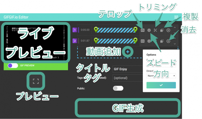 あとはそのままですが、動画が一つだけではなく複数の動画をGIFにして合わせることができるようですね。