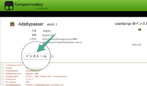 Skipperというスクリプトの方が有名だったそうですが、更新がAdsBypasserの方が最近ですし、バージョンが高いため、今回はAdsBypasserを使用します。